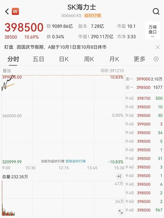 SK海力士涨超10%,为4月份以来的最大盘中涨幅,并创历史新高。