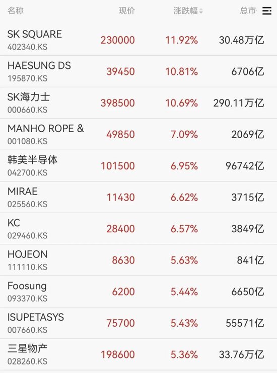 权重股方面,三星电子和SK海力士股价飙涨,三星股价涨超4%。